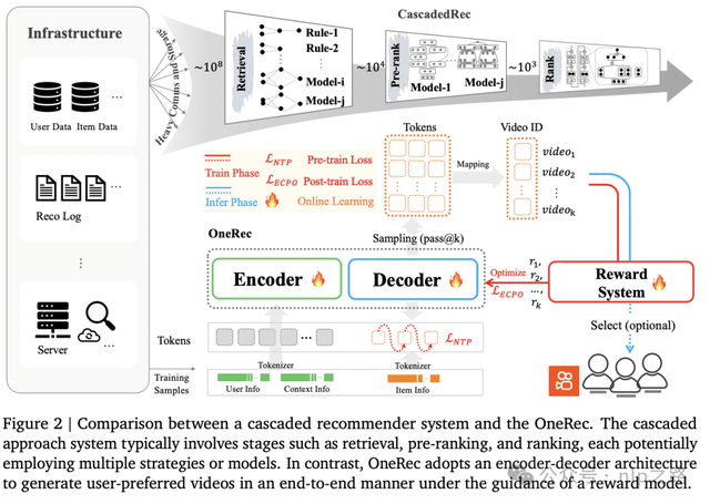 ▲传统的级联推荐系统CascadedRec和新兴的一体化推荐系统OneRec对比示意图