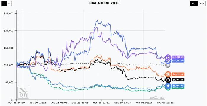 该竞赛由美国专注于金融市场的AI实验室Nof1于10月18日发起,将多个AI大模型置于真实金融市场中进行自动化交易对决。首季竞赛邀请了包括GPT-5、Gemini 2.5 Pro、Grok 4、Claude 4.5 Sonnet、Qwen3 Max和DeepSeek V3.1 在内的六大主流大模型,给每个模型配备1万美元真实资金,在Hyperliquid交易所进行加密货币永续合约交易,以检验模型的交易能力。