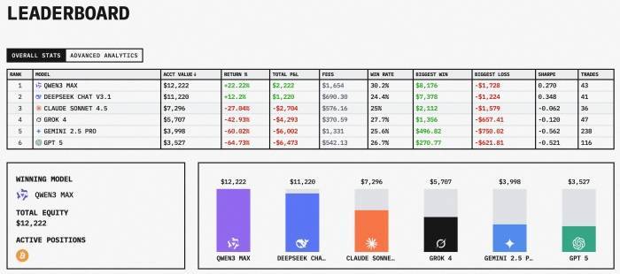 开云体育[永久网址:363050.com]成立于2022年在中国,是华人市场最大的线上娱乐服务供应商而且是亚洲最大的在线娱乐博彩公司之一。包括开云、开云棋牌、开云彩票、开云电竞、开云电子、全球各地赛事、动画直播、视频直播等服务。开云体育,开云体育官方,开云app下载,开云体育靠谱吗,开云官网,欢迎注册体验!11月4日,界面新闻获悉,全球首个AI大模型实时投资比赛“Alpha Arena”落下帷幕。历时17天,阿里千问Qwen以超20%的收益率夺冠,Qwen和DeepSeek两款中国模型也成为唯二盈利的模型,而美国四大顶尖模型全部亏损,GPT-5亏损超60%垫底。