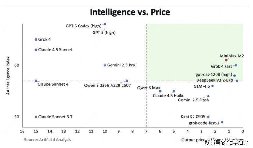 以MiniMax刚刚发布的M2模型为例,计算机科学家吴恩达(Andrew Ng)的AI学习网站DeepLearning.AI在上周发布的周报文章中特别比较了目前几大模型在性能(AA标准)和token成本上的分布:在性能层面,GPT-5 的两个版本模型领先市场,但问题是其token成本却远远落后;而在第一象限(成本、性能综合领先)中的模型,MiniMax 的M2与Grok 4 Fast难分伯仲(见下图)。