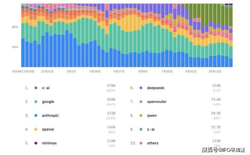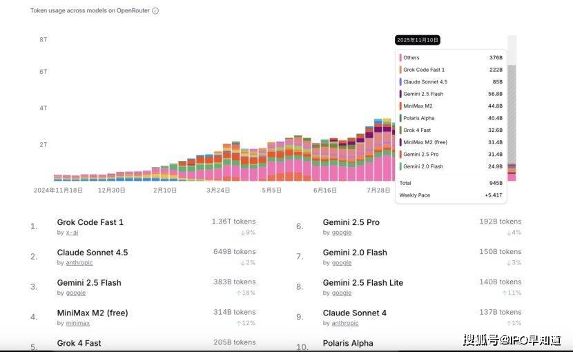 最新一周Openrouter的排名显示,MiniMax M2已经成为调用Token最多的开源模型,而排在前面的三个版本的模型分别来自于xAI、Anthropic和谷歌,均为闭源模型。