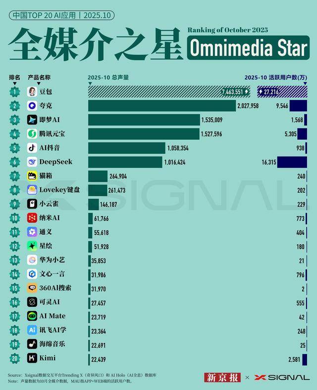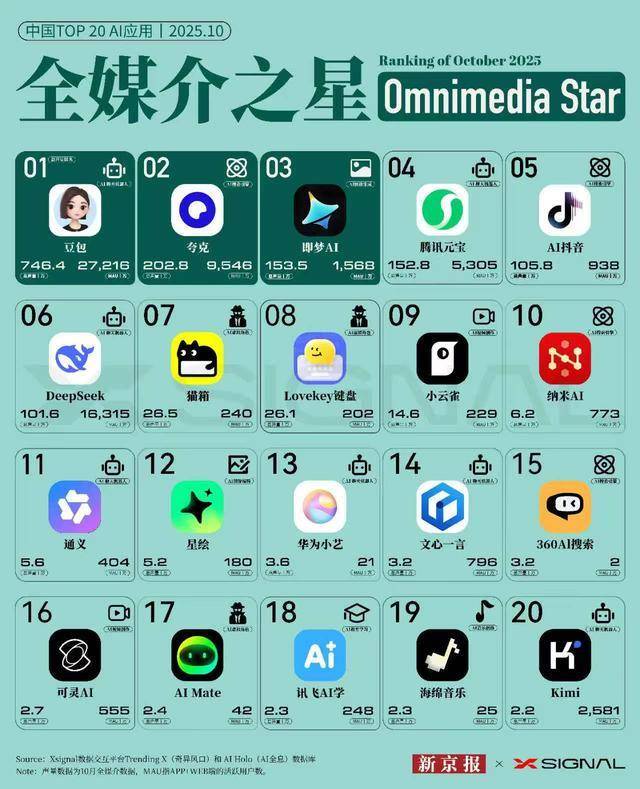 这份榜单由新京报AI研究院与Xsignal联合发布,根据全媒介声量梳理出2025年10月排名前20的国内AI应用,同时统计了应用的产品类别、所属企业及最新MAU(月活跃用户)数据,为观察国内AI应用发展趋势提供重要参照,这也是榜单自发布以来的第四期。